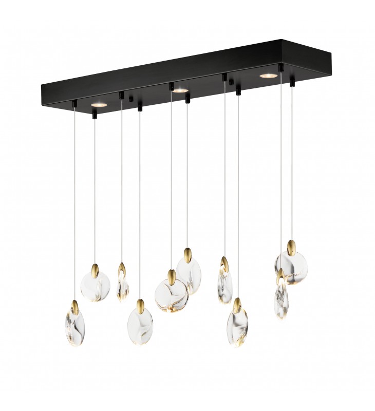 As if naturally formed from the ebbing shores of a riverbed, smooth and irregularly shaped crystal pebbles are suspended by cast metal clasps in a Polished Gold finish. Discreetly illuminated by concealed LED light sources within the clasps, additional downlight originates from LED GU10 lamps housed in a Matte Black canopy adding to the refracting iridescent shimmer on the crystal surface below. Available in multiple configurations of pendants as well as sconce options.