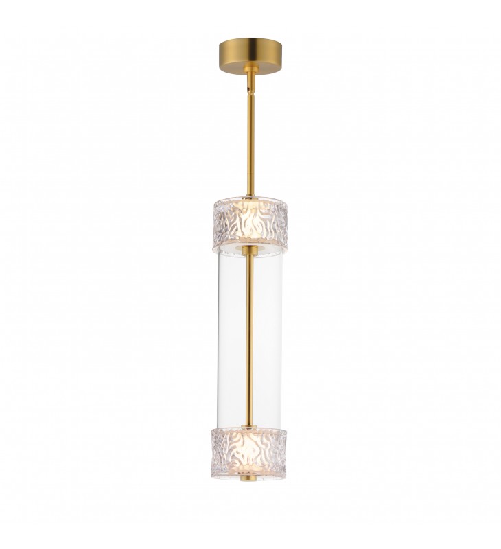 Segments of Clear glass cylinders are separated by distinctly rippled Clear crystal fonts on a thin Natural Aged Brass frame. The translucent segments are backlit with integrated LED illumination creating an airy, ethereal composition of glass textures. Available in vertical and horizontal configurations as well as sconce and portable configurations.