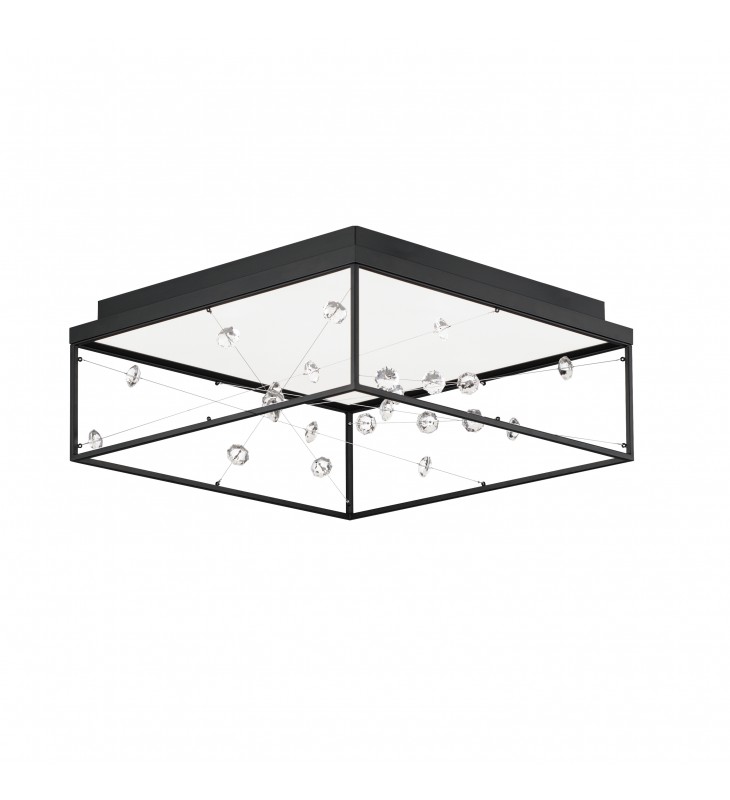A network of wire and crystal are suspended within a box frame illuminated from above. The light panel above highlights the iridescence of the crystal while providing ample illumination to the space below.