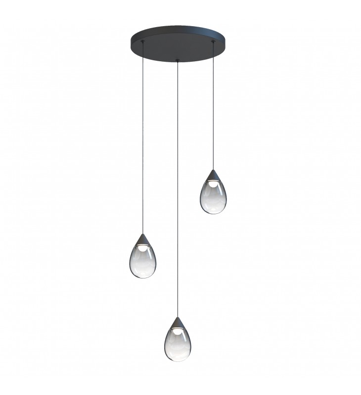 Suspended from slim cords, drops of blown glass encase a recessed LED light source casting light along the thick bottomed glass. Available in Polished Chrome with clear glass or Matte Black with Mirror Smoked Glass, this simple design adds a statement to light.