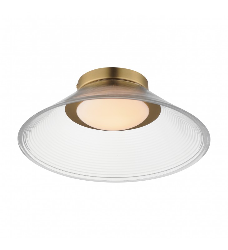 A tapered, ribbed glass shade adds a contemporary edge to a simple design. Available in Clear Ribbed glass with a plated Gold frame or in Emerald Green or Smoked glass with Matte Black frames. These retro-futuristic shades minimize peripheral glare, while a Matte White acrylic shallow domed diffuser softly disperses LED lighting, delivering ample illumination. The collection includes versatile pendant and flush mount options, with the latter doubling as a wall sconce.