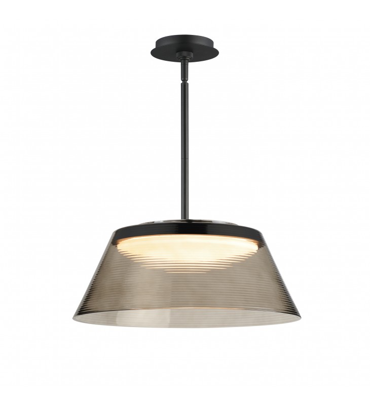 A tapered, ribbed glass shade adds a contemporary edge to a simple design. Available in Clear Ribbed glass with a plated Gold frame or in Emerald Green or Smoked glass with Matte Black frames. These retro-futuristic shades minimize peripheral glare, while a Matte White acrylic shallow domed diffuser softly disperses LED lighting, delivering ample illumination. The collection includes versatile pendant and flush mount options, with the latter doubling as a wall sconce.
