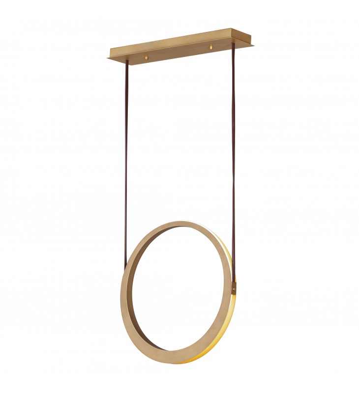 Tapered Antique Brass rings suspend from leather straps in this playful design. Within these rings, concealed LED light sources provide indirect light. This light casts light on neighboring rings while simultaneously illuminating the area above and below the fixture. Suitable for both modern and transitional settings.