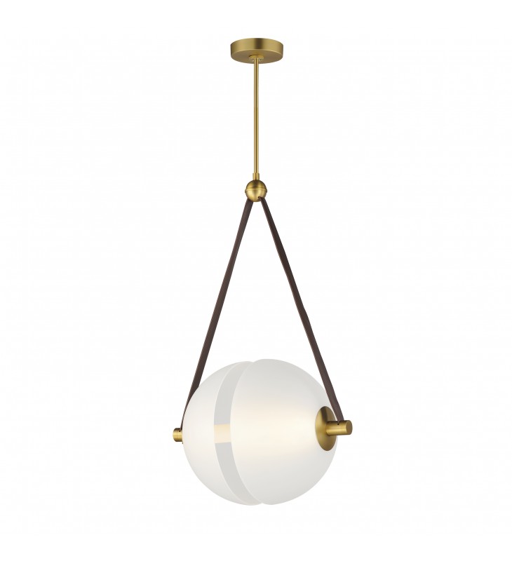 Send a message on the wire. Two semi-spherical frosted glass domes are separated by a tube of LED light and suspended by Tobacco Brown leather straps. The frames are complete in a contrasting Natural Aged Brass finish making the contemporary design softer and more applicable to traditional settings.
