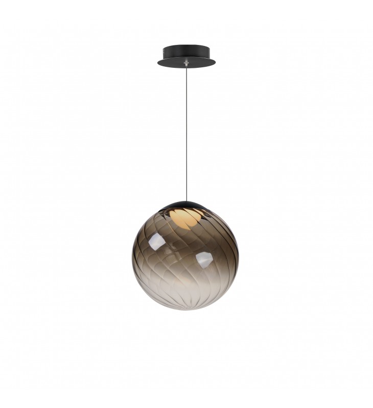 In a galaxy of light, ribbed and tinted glass is supported by swooping arcs of circular tubes. The Gold frame supports glass globe shades colored in Amber and Smoke tints that encase LED lamps provided. The single pendant has an over-sized spiraling glass shade in either Amber or Smoke, with a dome of light within and Matte Black components. Two configurations of wall sconces pair perfectly with the collection.
