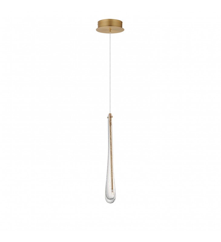 The classic teardrop glass shade is elevated in a luxurious collection of pendant configurations using substantially dense glass that are hand blown in elongated forms and curated into various color combinations. Suspended within the long, slender glass is a similarly long and slender socket to illuminate an energy efficient LED G4 lamp at the base of the glass. The slender tube running within the glass also supports the glass with elegantly flat thumb screws in coordinating finishes. Choose from Matte Black metal with Mirror Smoked glass for a moodier ambience, crystal Clear glass that accentuates the thickness of the glass walls paired with transitional Satin Nickel metalwork, or celebrate the design with effervescent Bubble glass and plated Gold metalwork.