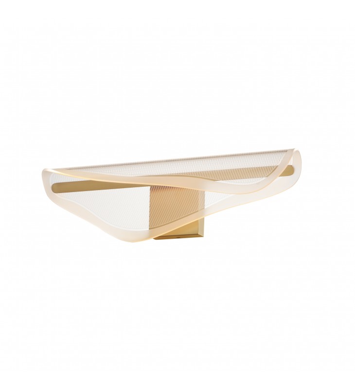 An undulating shape softly curls along its center to create an organic form constructed of a single panel of transparent acrylic. Further enhancing the form is the captivating effect of the frosted band around the borders and the patterned etching on the acrylic that captures the light. A coordinating wall sconce that features the same curled acrylic material and extends only 4 inches from the wall for ADA compliant applications.