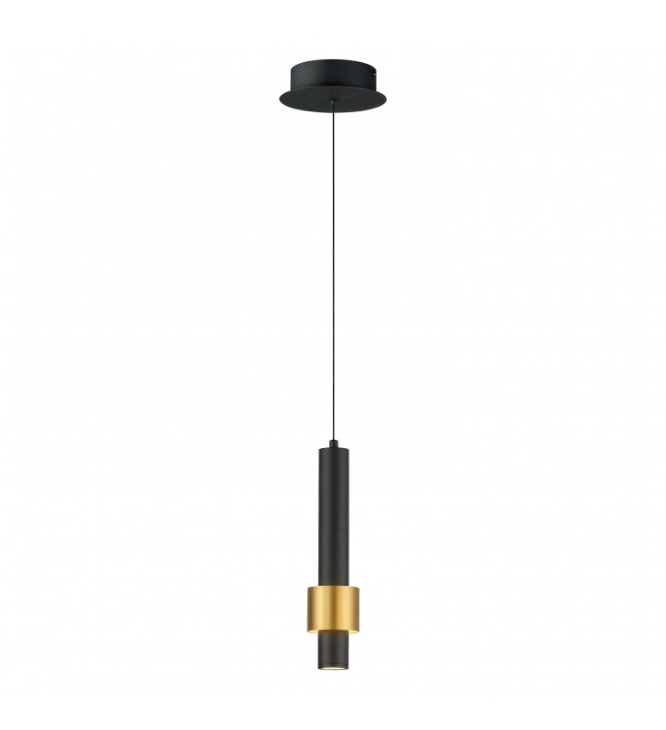 Tubular pendants finished in Satin Nickel or Matte Black in contrasting Satin Brass or Gold bands respectively. Light shines downward from the bottom of the pendant as well as a reveal of light behind the band.