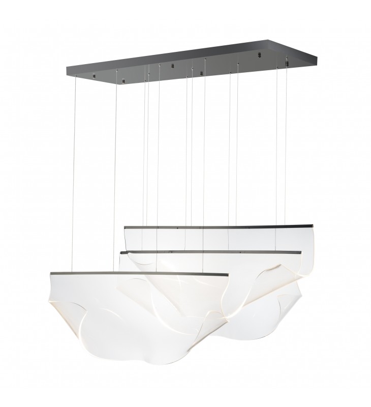 An airy arrangement of abstract forms, the Rinkle pendants feature sheets of transparent acrylic shaped by hand. The light guided acrylic captures the glow of energy efficient LEDs recessed within strips of shining stainless steel, obscuring the source of illumination. Delicately suspended by a series of thin wires, the pendants appear to be floating in an adjustable configuration of weightless light sculpture. Available in Polished Chrome, French Gold, and Brushed Gunmetal, its unique design adds a showstopping element to interior spaces.