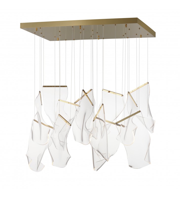 An airy arrangement of abstract forms, the Rinkle pendants feature sheets of transparent acrylic shaped by hand. The light guided acrylic captures the glow of energy efficient LEDs recessed within strips of shining stainless steel, obscuring the source of illumination. Delicately suspended by a series of thin wires, the pendants appear to be floating in an adjustable configuration of weightless light sculpture. Available in Polished Chrome, French Gold, and Brushed Gunmetal, its unique design adds a showstopping element to interior spaces.