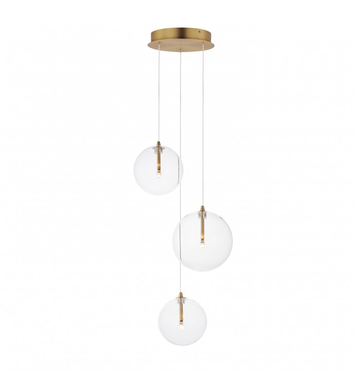 An airy configuration of Clear blown glass globe shades in various sizes suspend on thin low voltage wires. Thin tubes finished in Black or Gold descend into the center of the globes where a small G4 LED lamp provides a spark of light.
