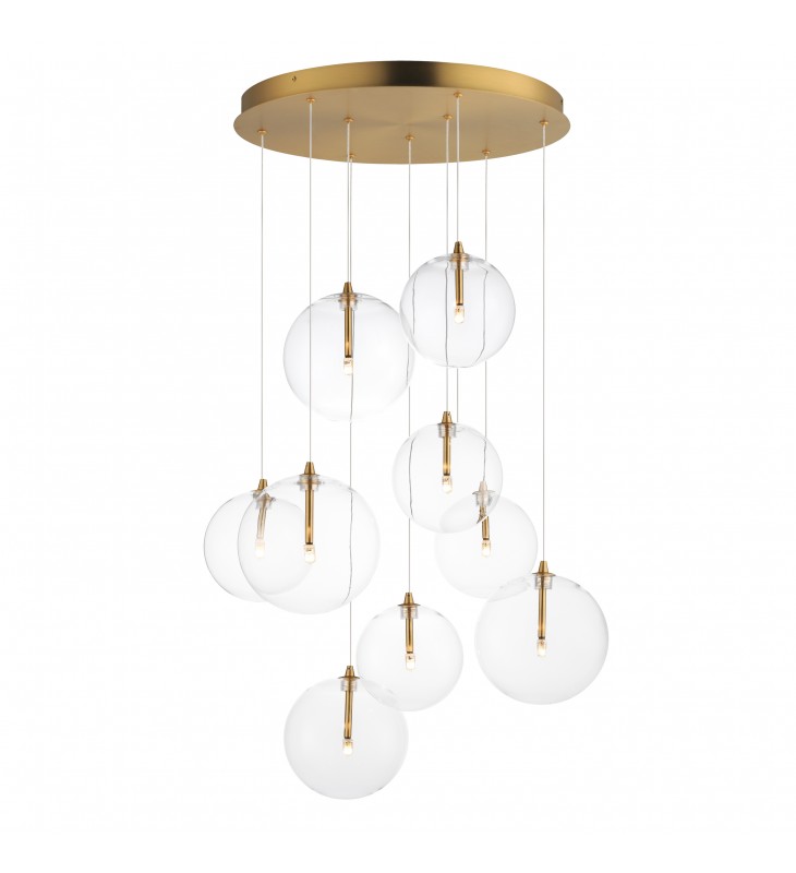 An airy configuration of Clear blown glass globe shades in various sizes suspend on thin low voltage wires. Thin tubes finished in Black or Gold descend into the center of the globes where a small G4 LED lamp provides a spark of light.