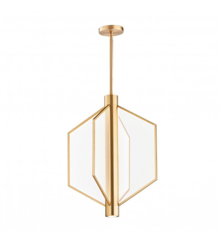 Translucent acrylic panels dotted to guide indirect LED strips integrated into the body of the fixture. The angular forms of the pendants create a strikingly modern display of light that is both airy and voluminous. An additional LED GU10 bulb is recessed at the bottom of the fixture for additional functional light. Available in Satin Brass or Matte Black finishes.