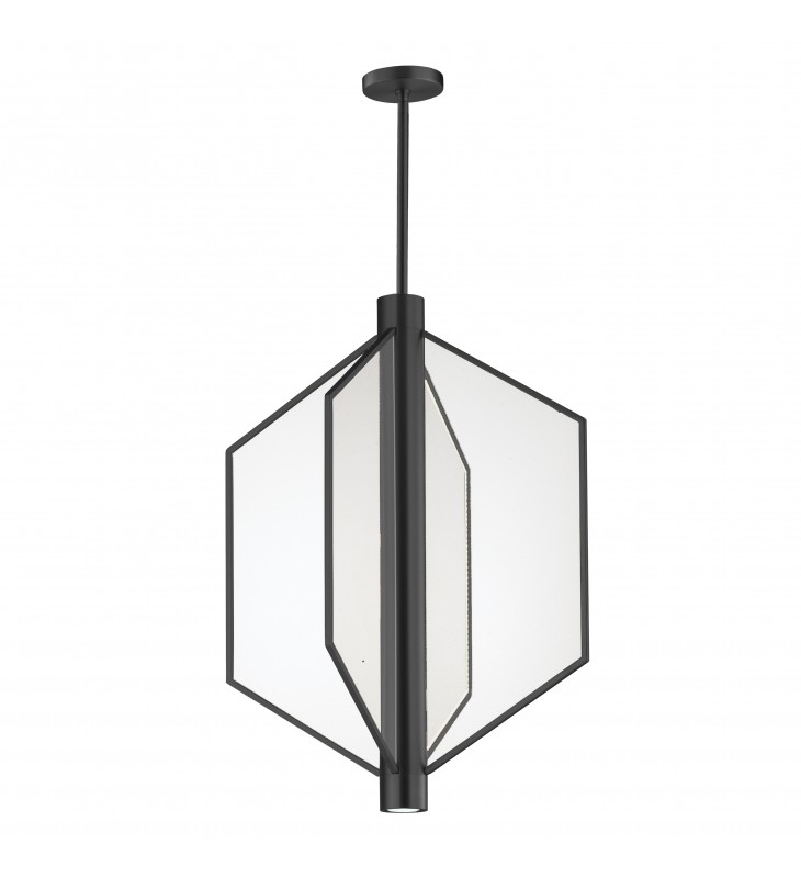 Translucent acrylic panels dotted to guide indirect LED strips integrated into the body of the fixture. The angular forms of the pendants create a strikingly modern display of light that is both airy and voluminous. An additional LED GU10 bulb is recessed at the bottom of the fixture for additional functional light. Available in Satin Brass or Matte Black finishes.