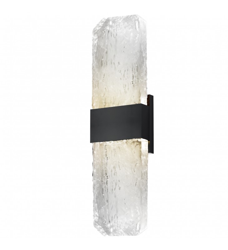 Artisanal cast glass slabs are supported by a Die Cast Aluminum bracket finished in an outdoor rated Black powder coat. Emphasizing the unique beauty of the glasses\' imperfect contours, the sconces accentuate these features with concealed LED lighting. Available in 3 size configurations, the sconces provide adequate lighting and showcase the craftsmanship of the artistic glass.
