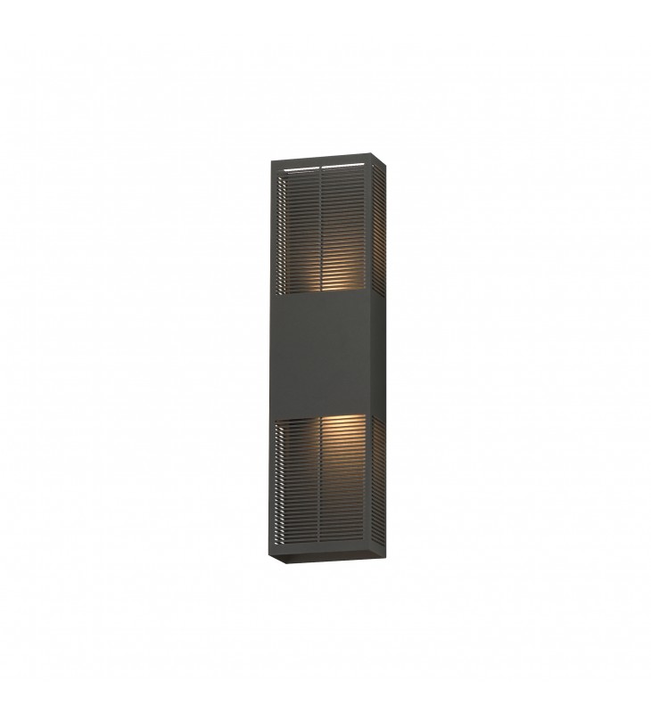 An array of precise slits are stacked in two columns on rectangular shade forms of various sizes. Housed in a blocked out space is a recessed LED light source that casts a filigree that radiate onto the surface surrounding the sconce making a dazzling display from the simple geometrical frame. Available in Matte Black or Architectural Bronze, the LED is a neutral 3000K.