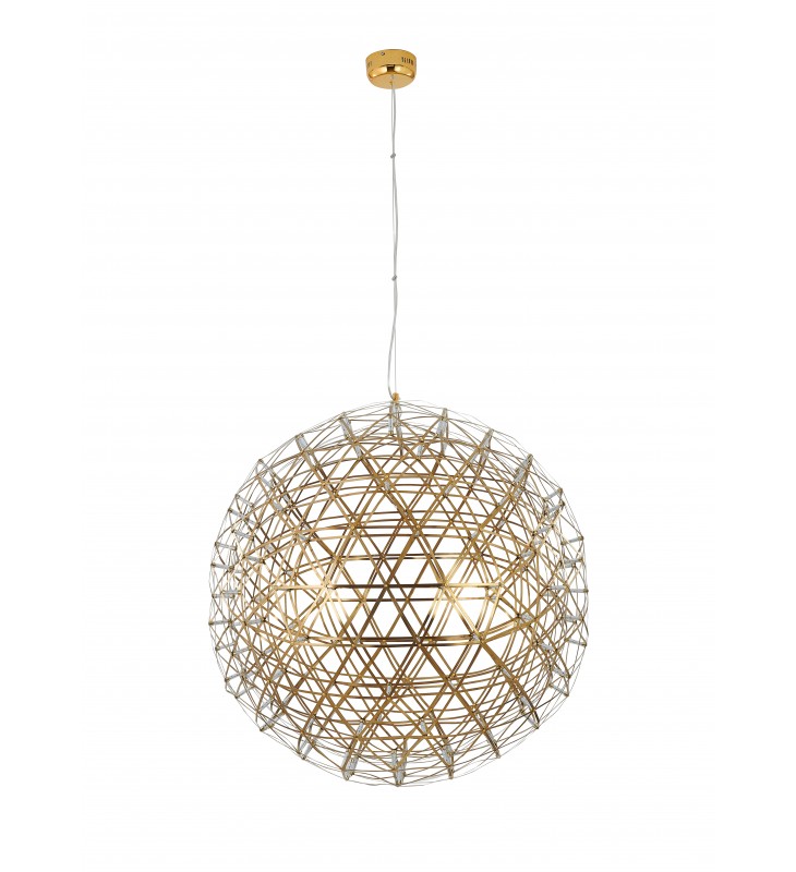 This globe LED lighting fixture is in a gold finish. The frame is made out of stainless steel and there are 162 LED lights on the frame. This is fixture can be used in any room, entryways and more.
