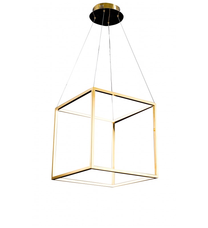 This floating LED box is in a gold finish. The frame is made out of stainless steel, and the shape of this fix is a cube. This is fixture can be used in any room, entryways, and more.