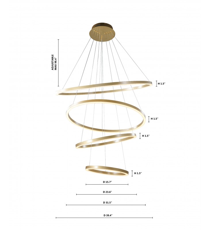 Product Feature : This LED lighting comes with three aluminum LED rings with white acrylic diffusers. This light has an LED color temperature of 3000K The cord is adjustable in height and is provided with 98.4" of hanging wire.