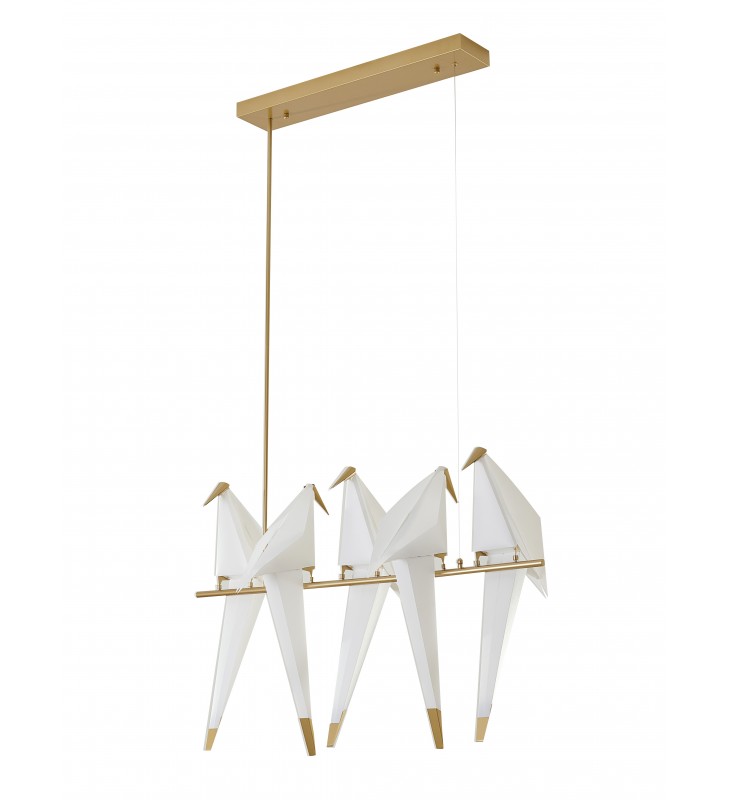 This unique LED lighting contains a gold carbon steel frame and five white plastic birds. The birds can be swung back and forth, and each bird is detachable and can turn light ON/OFF. It comes with 5 LED bulbs can provide enough illumination.