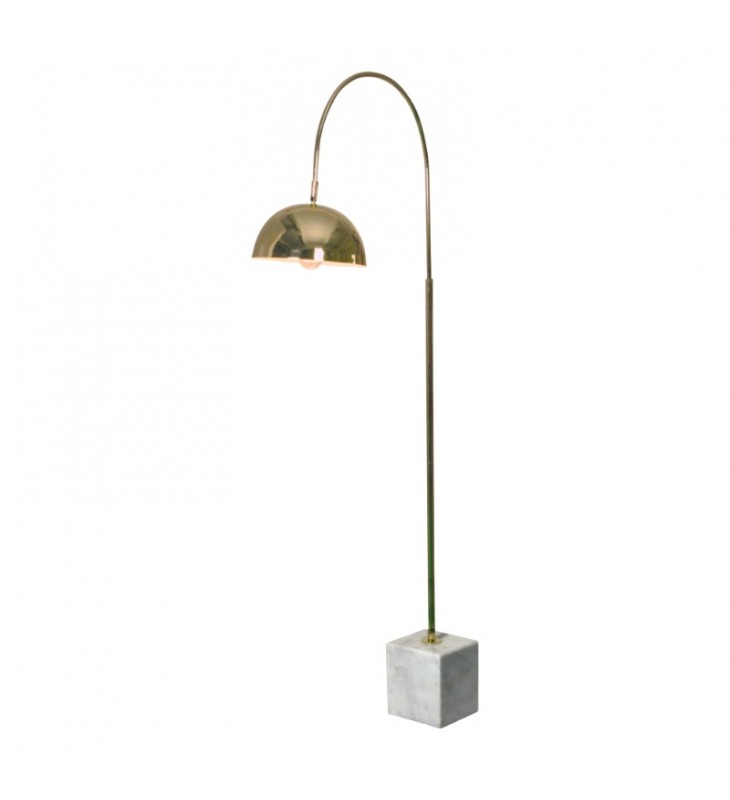 The artful swoop of this modern floor lamp recalls the retro era of 1960s Milan. Supported by the block of a white marble base, a round metal shade hangs from the arch of a sweeping metal rod. The polished brass finish on the dome of the lampshade conjures up mid-century glamour over contemporary couches and chairs.