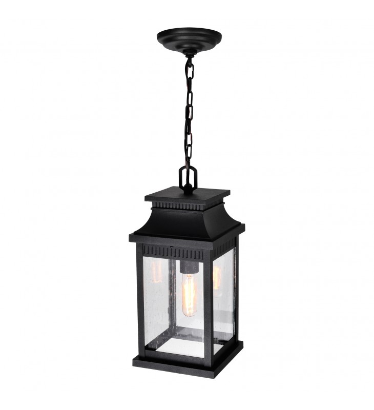 Ready to shine an abundance of light onto your space is the Milford 1 Light Short Outdoor Black Pendant. It features a classic lantern silhouette with its black metal frame and clear glass shade panels. When paired with a filament bulb, this hanging outdoor lamp with adjustable height can bring ample illumination and style to your outdoor entertainment area.