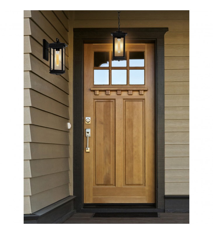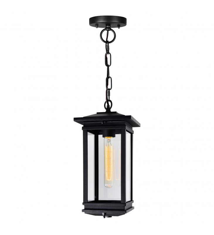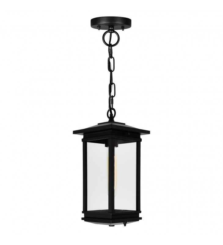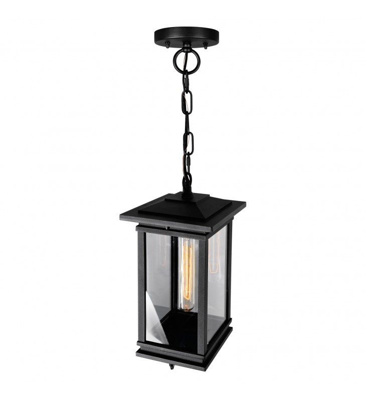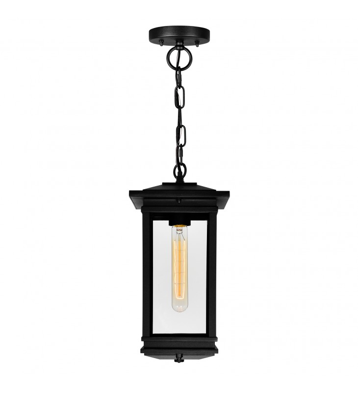 Radiating light sideways in all directions, this hanging lantern is the perfect fixture to illuminate your covered patio or outdoor seating area. The Oakwood 1 Light Outdoor Black Pendant is designed with a black metal frame with glass panes and an adjustable hanging chain. With this fixture\'s rectangular silhouette and clean lines, it can also lend a contemporary touch to your space.\n