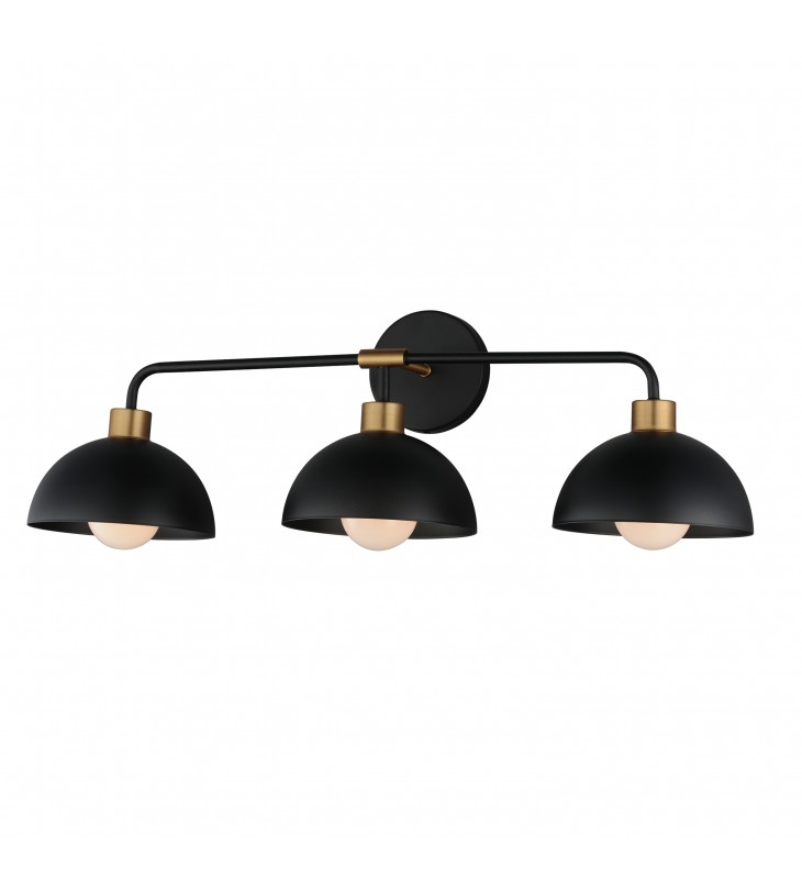 Dome shaped shades in Matte Black contrast Natural Aged Brass accents. Available in flush mount, bath vanity, and swing arm wall sconce configurations. This collection delivers an approachable, modern design that pairs well with transitional design aesthetics.