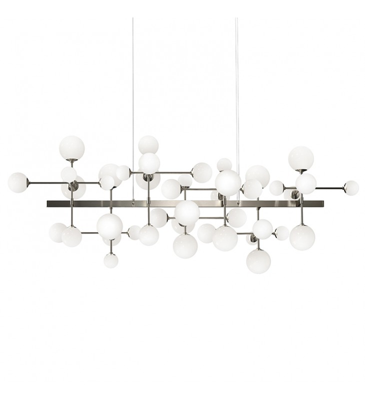 Intersecting stems form clusters of illuminated glass spheres in a dance-like rhythm. Mounted in precisely poised positions along rectangular beams in linear and rectilinear configurations of expansive scale, these Nebula constructions form illuminating sculptures of joyous activity in dramatic proportions. Also available as a Square Chandelier and Zig-Zag Chandelier.