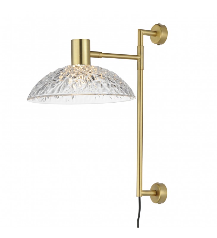 A modern take on the classic torchiere, the bright Satin Brass frames support thick textured glass cauldrons illuminated with dedicated LED modules. The 2-Light pendant and swing arm pin-up sconce feature rotatable shades directing the light either upward or cast directionally downward. The deep pattern in the glass sparks curiosity and fascination with its organic and abstract surface. It creates interest in the LED light source behind it while casting even light through the artistic vessels\' design. Available in various configurations of pendants and sconces, the collection celebrates classic design concepts in an understated contemporary glamor that results in a composition suited to transitional and contemporary aesthetics. Make a statement with the oversized with the 3-light sconce nearly five foot in height or use the multiple functional pieces for reading our over an island.