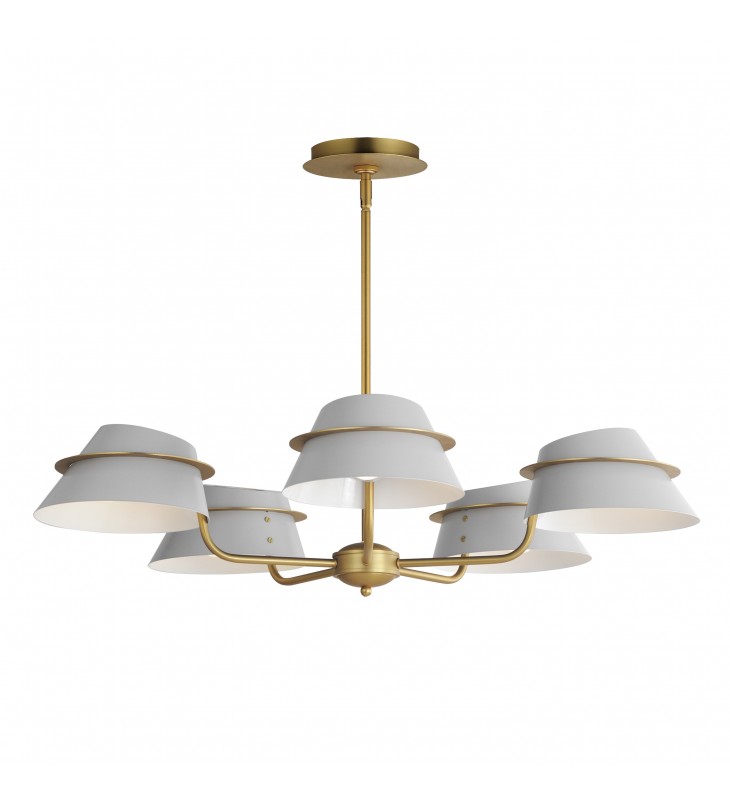 Metal shades of Light French Gray are suspended from halos of Natural Aged Brass. Maximizing the light output, the interior of the shades are painted white and their tops are left open casting light both upwards and below. The collection is completed by a delightful pull-chain operated wall sconce that provides a practical light source ideal for a reading nook or bedside.