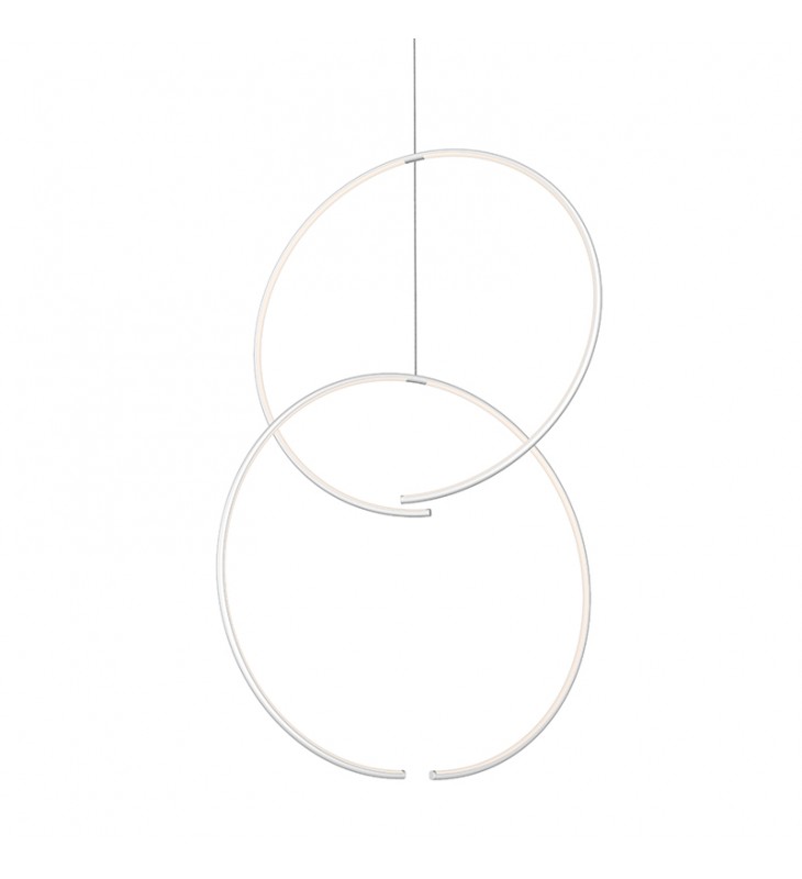 The movement of offset arcs rotate in suspension to form a modern interplay of deconstruction. Also available as a single pendant.