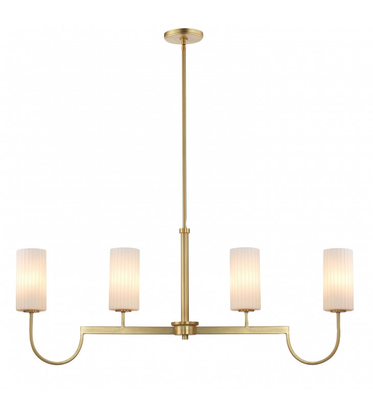 Whether in town or countryside, this collection of chandeliers simplifies the classic curved frame with a modern approach. Finished in your choice of Satin Brass or Matte Black, the sharply curved arms extend higher than classic proportions and support ribbed cylinders of opal white glass shades. These Satin White glasses upgrade pleated shades by form of their ribbed details. Available in two sizes of chandelier and a linear 4-light pendant, this collection finds its place at home in a variety of applications and fits in regardless of whether its town or country.