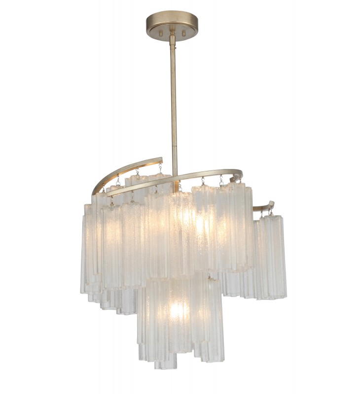 Cascading Waterfall glass shades are suspended from a frame finished in our popular Golden Silver. This elegant collection spans design genres from contemporary to traditional which gives it universal appeal.