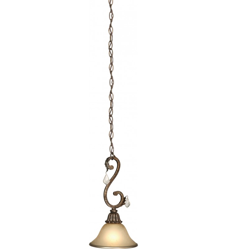 Florence 1 light Chain pendant carefully decorated with caramelized glassware with hand applied gold trim set on top of detailed shapes of various shadings of bronze finishing, with beautiful compliments of crystal jewels (Also compatible with Energy Efficient screw type compact fluorescent bulbs)\n \n \n \n