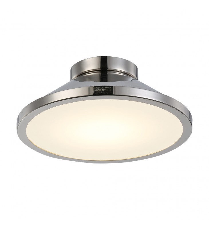 Want to make a statement where you cannot fit a large chandelier? Look no further than the Lucida collection designed by Kevin Kraemer?? Illuminated by energy efficient bright LEDs, this metal shade flushmount with white bottom glass diffuser would make a great addition to any surrounding. Shown in polished nickel, but also available in black or white.