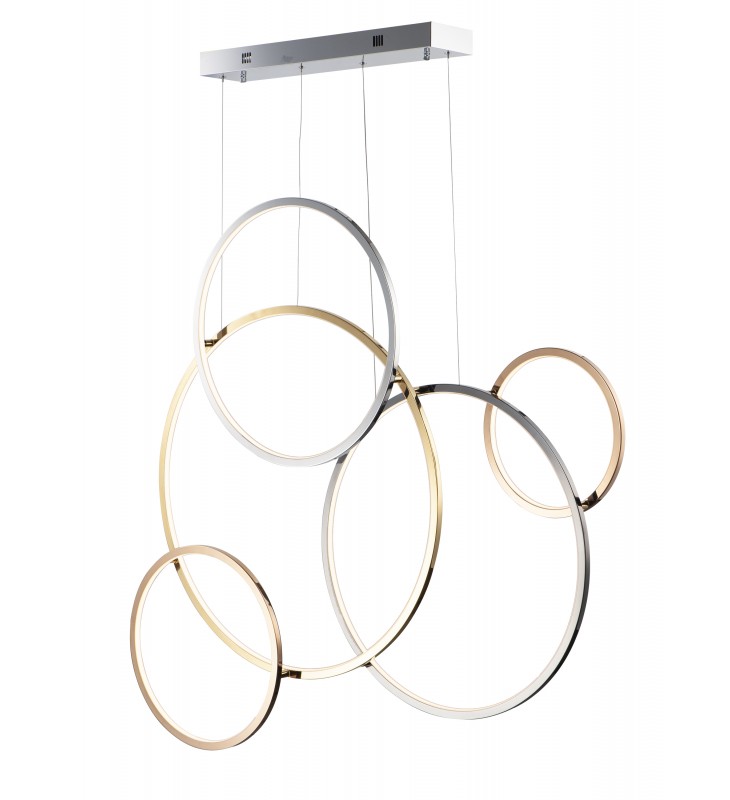 Intersecting rings for this large scale sculpture available in either vertical or horizontal configurations. Multiple high end finishes were used to blend in with today\'s eclectic interiors. The perfect fixture to fill a large space, this can also be installed against the wall as artwork.