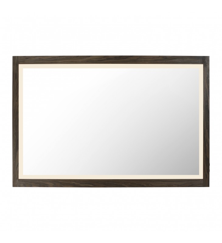 A wood-framed mirror is offered in a choice of Walnut or Distressed Oak, combining natural elements with modern functionality. A 2-inch frosted band along the frame\'s interior is backlit with LEDs, providing optimal illumination above a vanity. A discreetly hidden control along the edge of the frame allows easy selection between 2700K, 3200K, and 4000K color temperatures for personalized lighting.