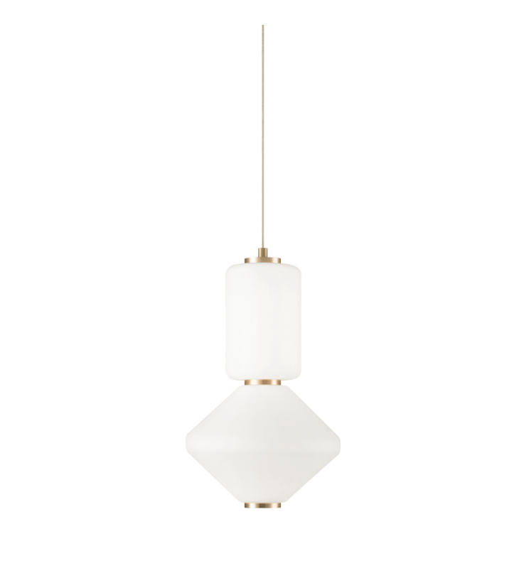 A unique series of pendants. Dango is comprised of opal glass in the form of geometric shapes complemented by Oxidized Gold or Oxidized Black detailing. 2 styles will be available - all the same glass or a mixed glass version. Additional glass can be purchased separately to create a unique personalized fixture. Available in 4 sizes.