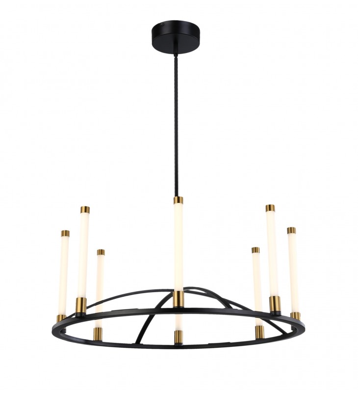 The Infiniti Collection by Steven Sabados of the S&C design firm, is stunning and quite unique. The frame is a matte black and the candle sticks are illuminated by bright energy efficient LED which have brass accents on both ends. 8 light round chandelier shown.