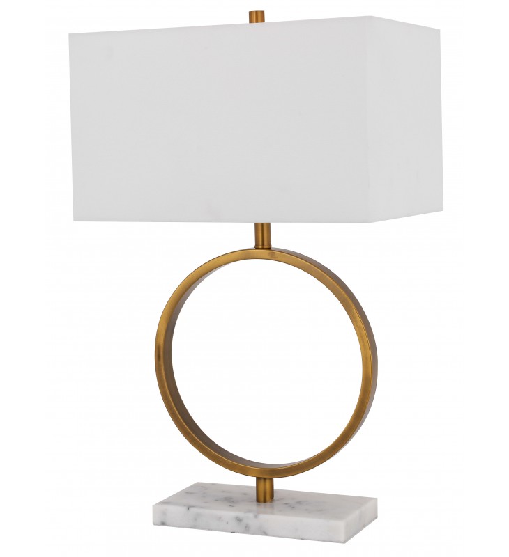 This unique table lamp is in gold and white finish, the frame is made out gold iron with a white marble base. It comes with a white boxed shade. It is great for chair side reading or general room illumination.