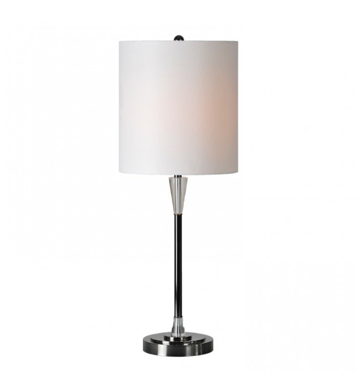 A tall slim metal body accented with a crystal cylinder, and topped with a clean white round linen shade - proves simplicity can be striking. Finished in a dark brushed nickel, this lamp?s elegance is sure to add style to any space.