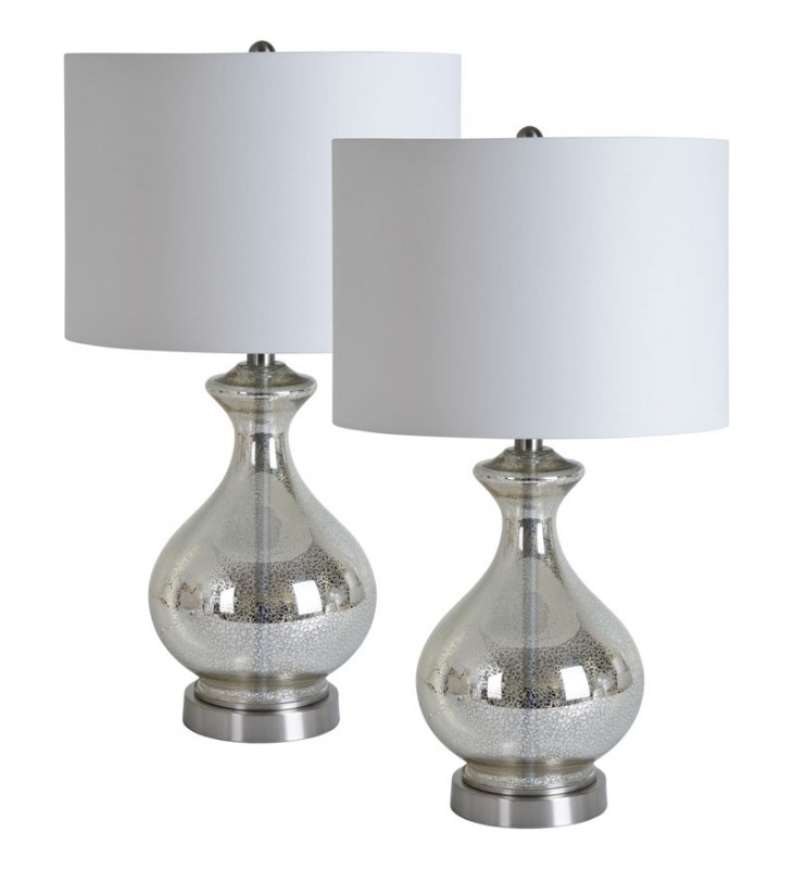 Table lamp - Set of 2 - Glass with antique mercury finish - Iron base with brushed nickel finish - White cotton shade - Max 100W - 3-way switch - E26 socket