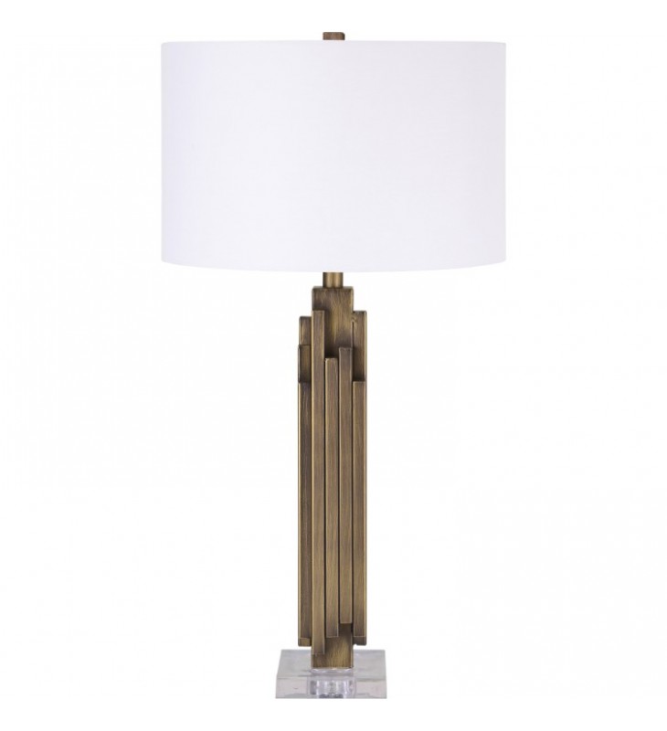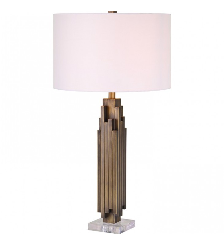 The striking profile of this modern table lamp takes its structural cues from metropolitan skyscrapers. An accent light fixture for an end table, console or desk, the clear acrylic pedestal and metal base features individual columns of forged iron that wrap around the rectangular pillar in an offset pattern that emphasizes its vertical design lines. The contemporary table lamp is finished with an antique bronze patina and topped with an off-white cotton drum lampshade.