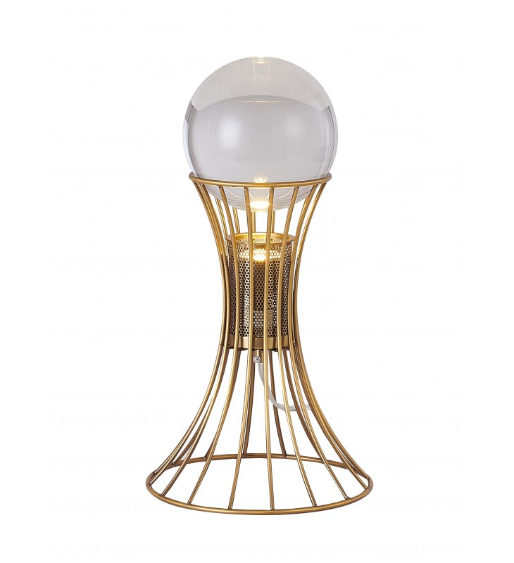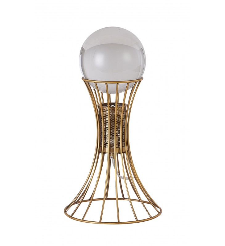 This exquisite table lamp is in an antique brass finish. The base is made out of metal, and there is a crystal ball in clear color on the top. It also comes with an ON/OFF switch. This table lamp is great for chair side reading or general room illumination.