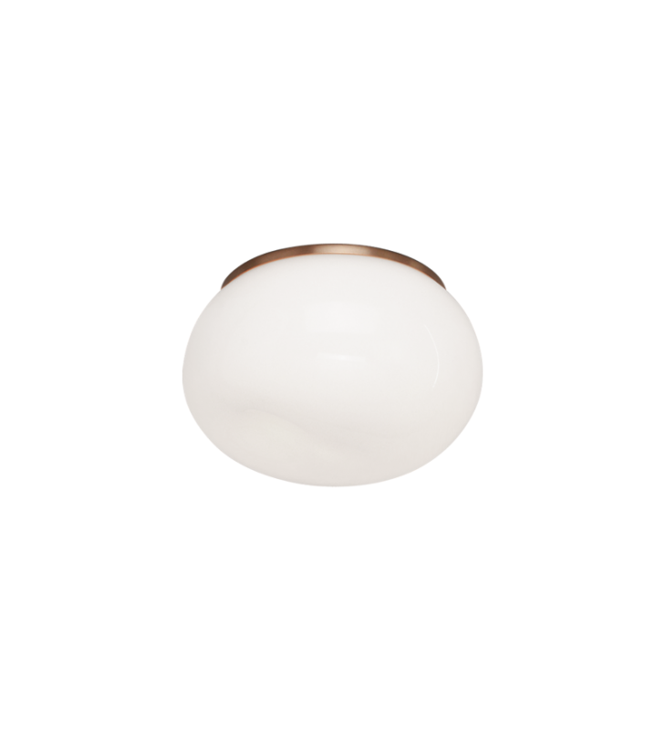 A contemporary flush mount and vanity series. Gelasin features a thin canopy attached to a hand blown Opal glass with a unique dent which adds to the aesthetics. Available in 2 sizes and 2 finishes