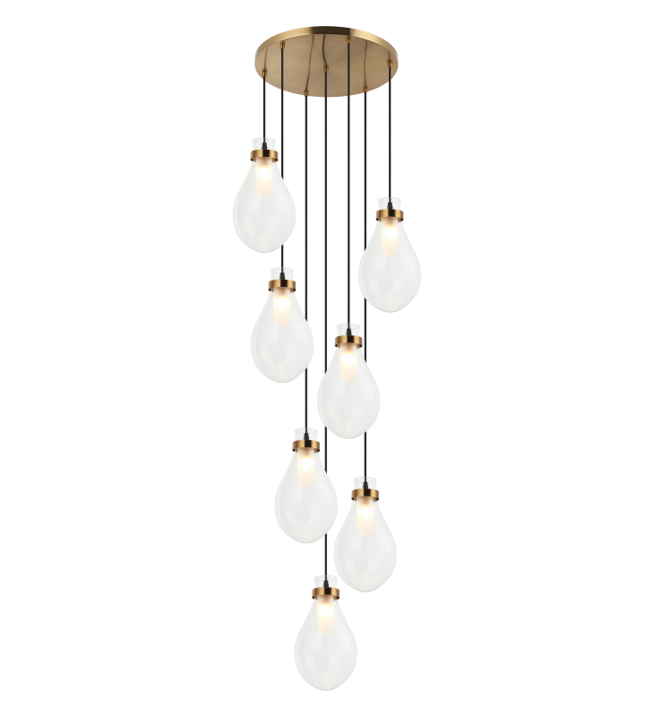 Seranna The Seranna family is available in Aged Gold Brass or Matte black with teardrop shaped clear glass. The graceful drop style wall sconce, single pendant and cluster pendants in three, five and seven light options are all beautifully elegant and will present a stylized look in any room. *LIGHTBULBS NOT INCLUDED
