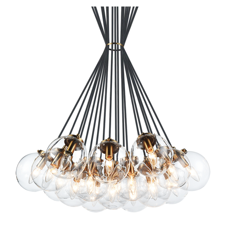 This series comes in several different models depending on the number of light bulbs.The light is designed with a candelabra based bulb covered in spherical glass with a choice of Aged Gold Brass or a Chrome finish. All sizes of this series are available with clear or opal glass. Both finishes are completed with a black fabric cord. You can hang these fixtures with different lengths of cord depending on the look you are going for.The ring that keeps the cords tight can also be removed if so desired. *LIGHTBULBS NOT INCLUDED
