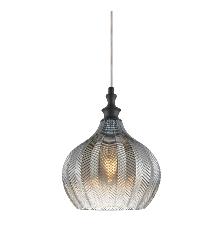 The Renity series features an elegant design of chevron textured glass, matched with either Aged Gold Brass or Smoke finish.These sophisticated pendants will add charm to any space. Available in 2 glass shapes.