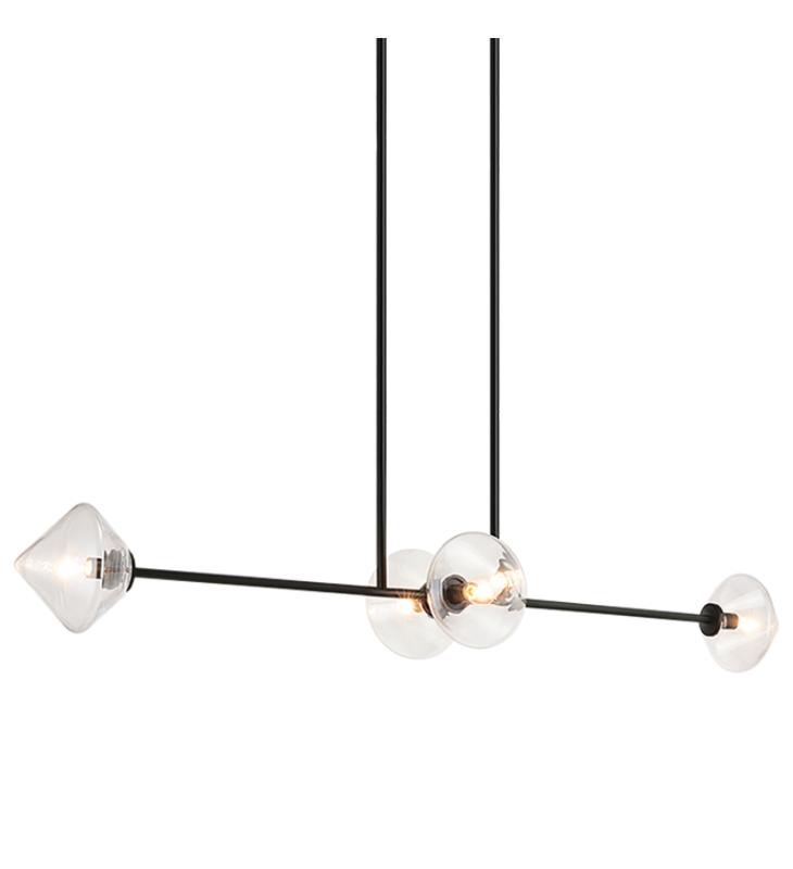 Novo is modern yet classic ¨C available in the form of chandelier, wall sconce, and flush mount. The rods and base are either Aged Gold Brass or Black finish paired with a contrasting Opal or Clear round glass and diamond shaped glass. The style is very versatile and will add beauty to multiple rooms.